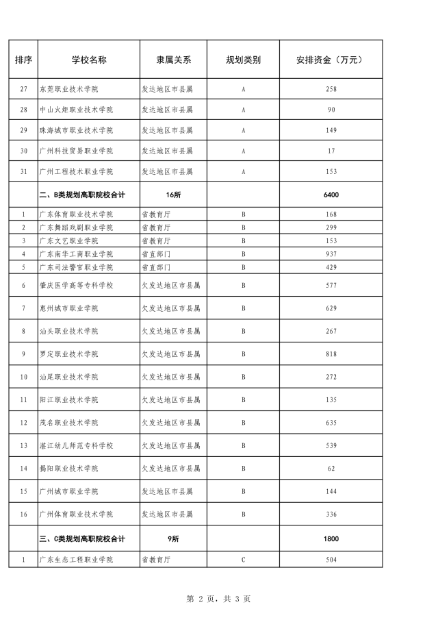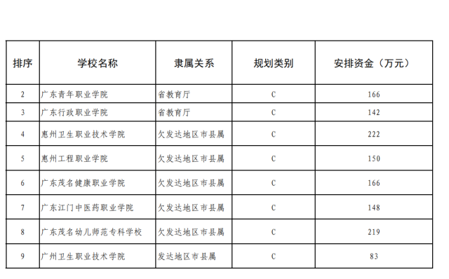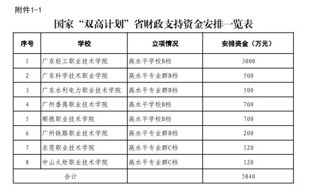 在公示的安排方案中,国家“双高计划”高职院校收到了省财政支持资金的第一个“大红包”,共5400万元。其中,高水平学校B档的广东轻工职业技术学院,安排资金3000万元,广州番禺职业技术学院、顺德职业技术学院700万元;高水平专业群B档的广东科学职业技术学院、广东水利电力职业技术学院500万元,广州铁路职业技术学院200万元;高水平专业群C档东莞职业技术学院、中山火炬职业技术学院120万元。