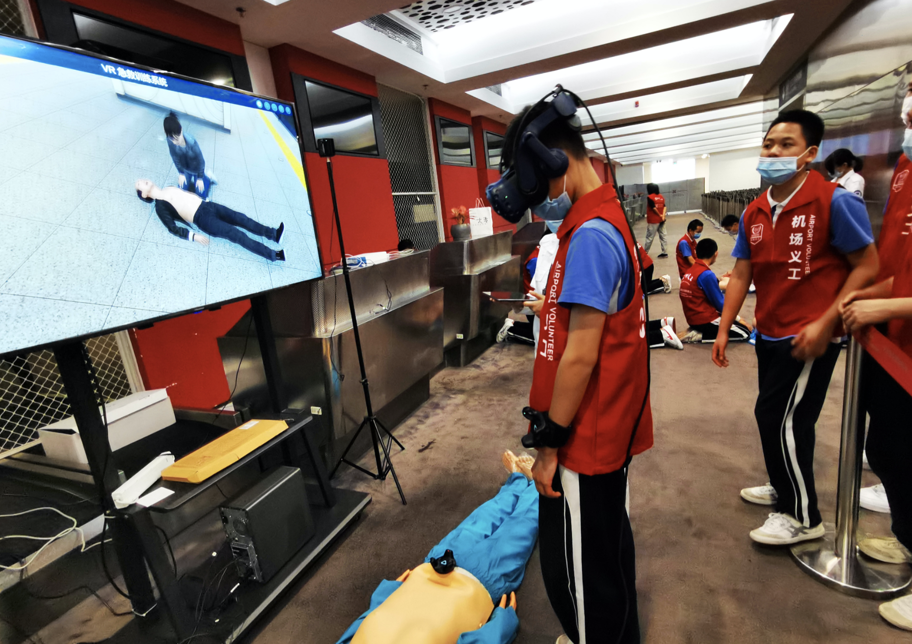 全新设立的VR急救小屋位于深圳机场航站楼四楼值机J岛,分为VR体验区、实操练习区和视频观看区。在VR体验区,通过创新引入VR技术,参训人员在佩戴VR眼镜、操作手套等设备后,即可在VR技术建立的院外火灾、院外地震、院外车祸、溺水等虚拟场景中,“身临其境”地体验学习现场环境评估、心跳呼吸判断、胸外按压、通气、AED电击除颤等心肺复苏施救全过程,沉浸式、互动式体验让学员们可以更好掌握急救知识和技能。