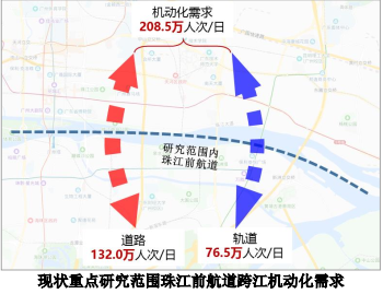 前期交通调研显示,琶洲区域现有过江通道通行能力不足,广州大桥-官洲水道范围的跨江道路整体运作更是处于饱和状态。统计数据显示,范围内现状出行总量 208.5 万人次/日,其中道路出行 132.0 万人次/日,轨道出行 76.5万人次/日。其中琶洲西隧道所在的华南大桥-琶洲大桥段现状道路出行 49.7 万人次/日。
