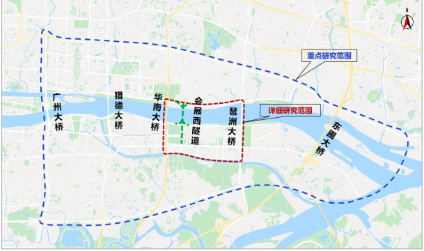 结合城市片区来看,会展西隧道位于珠江前航道中部,紧邻金融城、琶洲、互联网集聚区等广州中心城区重点片区,是广州科技创新走廊重要廊道,地处“珠-金-琶”黄金三角地带的中心位置,是联系珠江两岸的重要通道,可以支撑琶洲地区及金融城的发展。