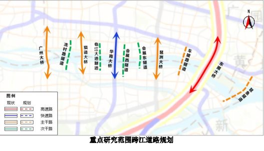 琶洲区域的广州大桥-官洲水道范围内现状过江道路共5条,分别为广州大桥、猎德大桥、华南大桥、琶洲大桥(科韵路)、东圃特大桥(环城高速),均为区域性南北连通性高等级道路。