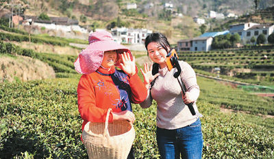↑主播在湖北省宜昌市夷陵区太平溪镇早茶基地直播采摘春茶。张国荣摄(人民图片)