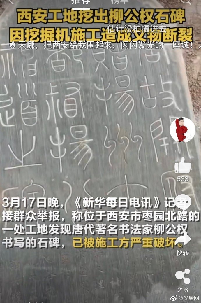 新华每日电讯报道了施工方破坏石碑的消息。西安市文物保护考古研究院连夜组织来自砖石质文物保护国家文物局重点科研基地、西安碑林博物馆、中国社会科学院考古所三位专家对石碑进行意见咨询,专家判定碑体残断茬口为旧茬口,结合碑体材质特征、体量大小,不存在外力挖断的可能性。