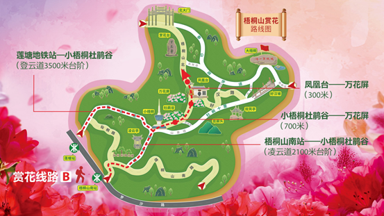 为方便市民群众上山赏花,此次花会共设置三条赏花线路和三个赏花地点,每条线路、每个地点所饱览的美景各有特色。“从梧桐山北大门沿着上山公路依次到凤凰台、万花屏、杜鹃谷,此为赏花线路A。从地铁8号线梧桐山南站穿越仙桐体育公园,走登云道或凌云道即可到达杜鹃谷、万花屏和凤凰台;这是路线B。”黄斌介绍道,路线C大体上与路线B相同,唯一有变化的是从豆腐头到好汉坡,可欣赏映山红和丁香杜鹃的风采。
