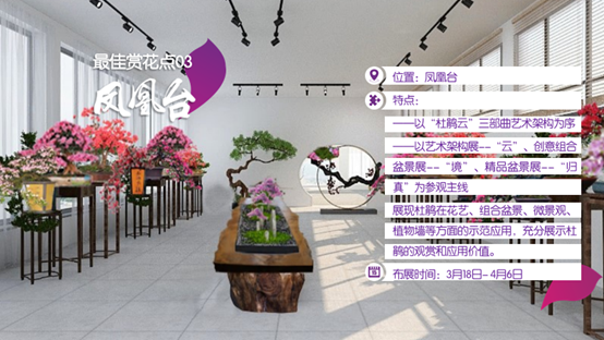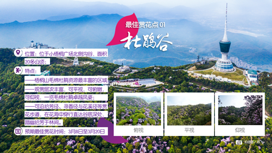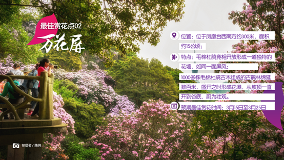 记者了解到,梧桐山最佳赏花地点非小梧桐广场北沟的杜鹃谷莫属,约20公顷的山地上组成了绝美的毛棉杜鹃花海。在凤凰台西南约300米处的万花屏,1000多株毛棉杜鹃古木组成的杜鹃林绵延数百米,花开之时形成从坡顶至谷底的花瀑,令人称奇。由人工精心布置的艺术盆景展位于凤凰台,此为第三个赏花点。“在万花屏沟谷里还有一批‘百岁老人’,它们就是500多株上‘百岁’的毛棉杜鹃;更激动人心的是,从万花屏下去250米左右,还有一株千年杜鹃王,它的直径达到58厘米,树高10.5米,要两三个成年人才能把它合围。”黄斌表示。
