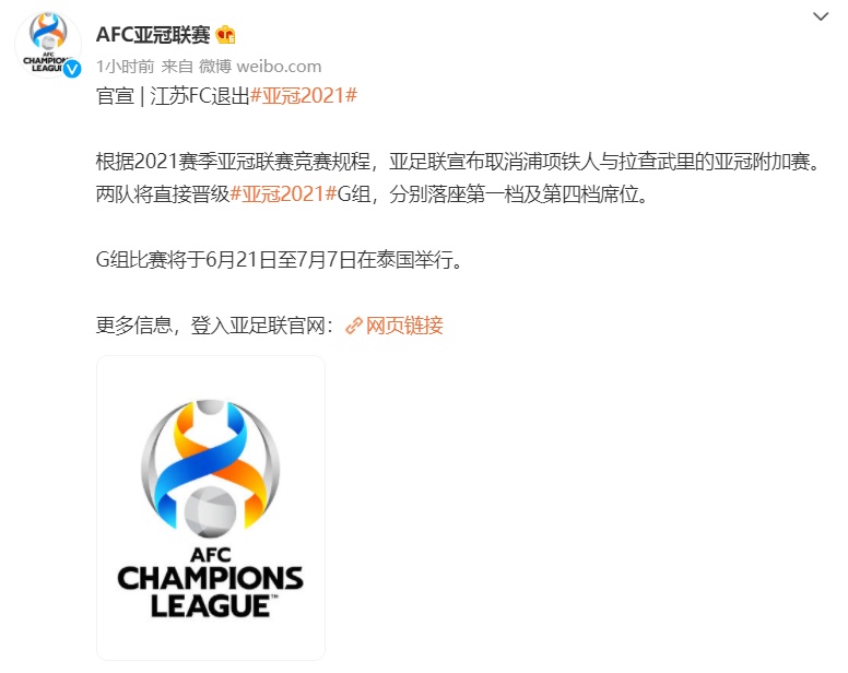 据亚足联亚冠联赛官方微博3月18日消息,亚足联当日官方宣布江苏FC退出亚冠2021。
