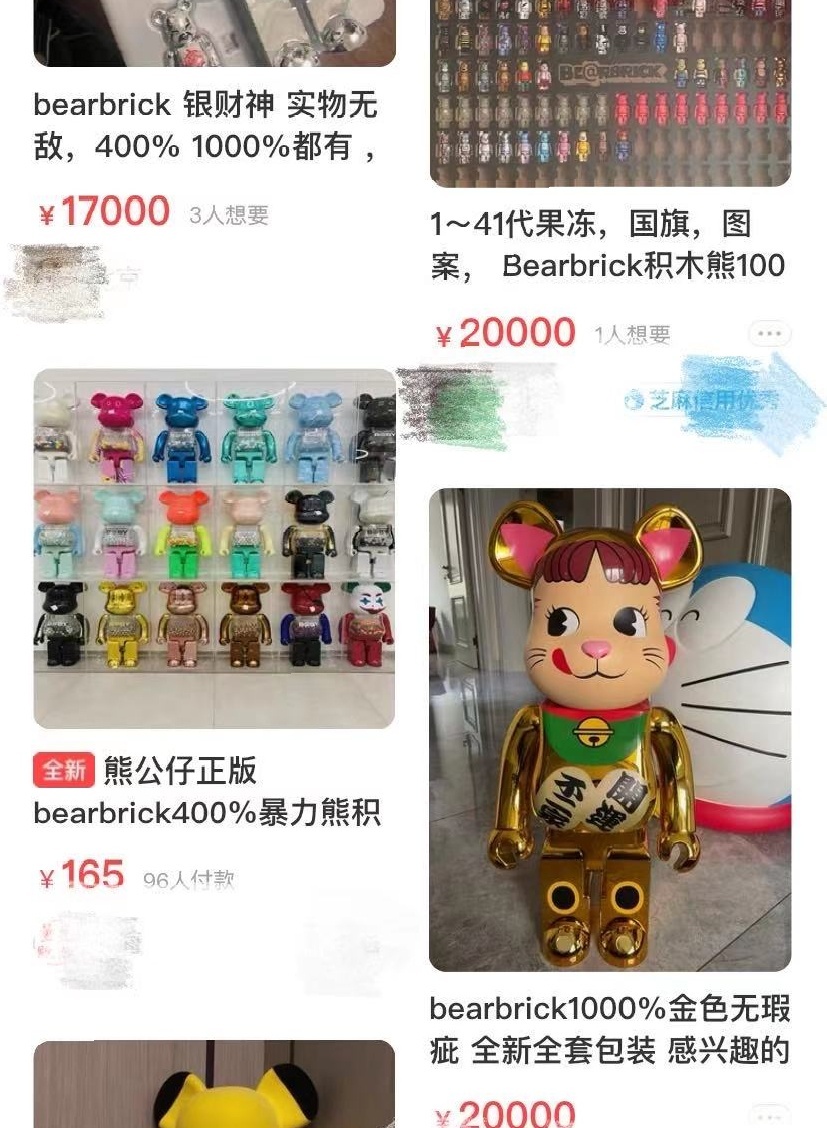 在日本发售的原价三千元左右的70cm高积木熊,进入国内,价格少则上涨一两千元,多则暴涨数万元。特别是款式越稀有,市场价越高。某交易平台上,积木熊的价格从一百多元到十万元以上不等。其中1000%规格的积木熊颇受欢迎,国内发售价平均在3500元到4000元之间。可以看出,买“熊”的花费并不小。