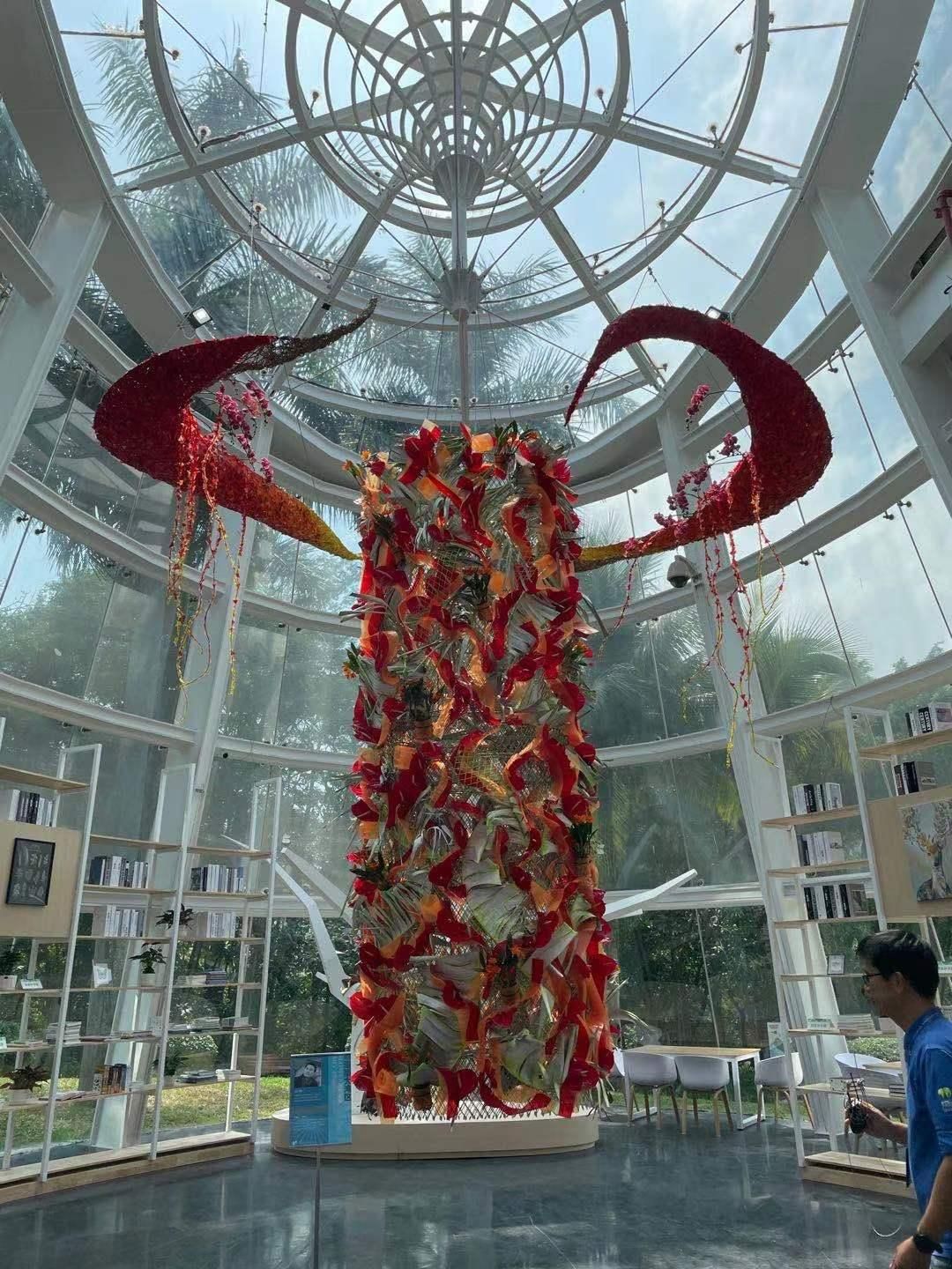 福田区节日大道以“对话”为题,结合800米长地形特点,以花卉形象“深圳牛”贯穿整个场景进行艺术装置,通过快闪式花艺展示形式,让柔美自然的花卉与激情速度的城市实现对话。