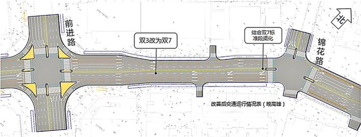 方案:前进路-锦花路段取消辅道,断面路段从双向3车道调整为双向7车道,结合断面优化锦花路交叉口渠化方式,改善后节点通行能力提升44.3%,整体服务水平较高。