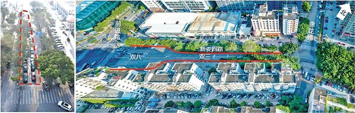 方案:设置非机动车道,打开封闭式绿化空间,增加上下学接送驻留面积,沿新安三路设置机动车临时停放泊位,限时泊车接送。
