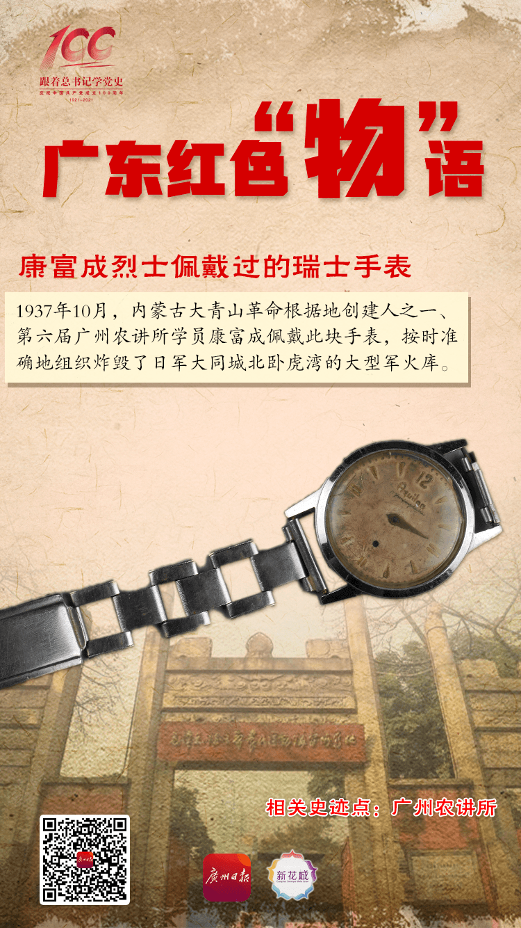 83年过去,卧虎湾的硝烟早已消散。而在毛泽东同志主办农民运动讲习所旧址纪念馆(以下简称农讲所纪念馆)中,我们仍能看到这次精彩的破袭行动的见证物,那是康富成当时佩戴的一块手表。