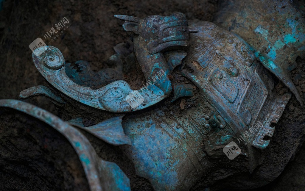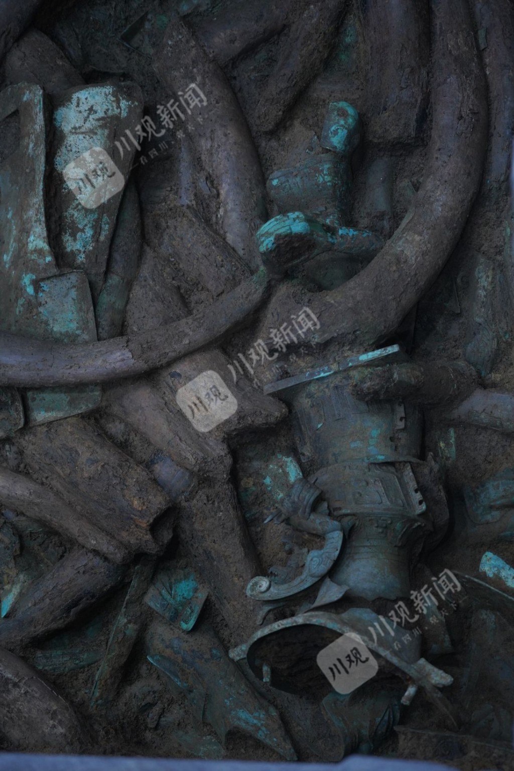 大口尊、青铜罍、顶尊跪坐人头像、青铜面具……在此次发掘的3号祭祀坑中,发现了数十件造型奇特精美、保存相对完整的青铜器,又是一座青铜器的宝库!