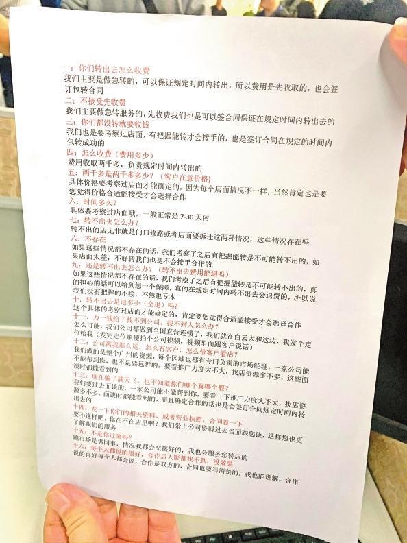 "服务费是 4000 多元,我们负责在规定的时间内转出去。"电销部员工黄小敏的手机停留在微信聊天页面,上面有她与客户的聊天记录。而在她的微信通讯录里,所有好友(潜在客户)都按照地点、名字、所转店铺经营内容、转让费用及收取的服务费用的格式进行备注。