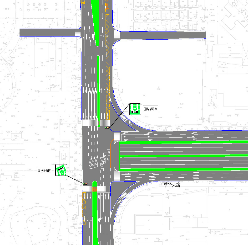 据统计,每逢工作日 早晚高峰季华路-文华路路口南北方向交通量便达到2000pcu/h-2500pcu/h。该路口由于下有季华路隧道,南北距离很长。考虑到这一特点,禅城区治堵办计划结合禅城季华路-岭南大道、季华路-南海大道等路口微治堵的成功经验,对该路口实施相应对策,即南北进口增设待行区。