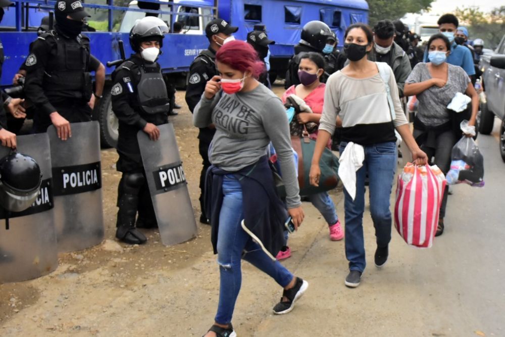 1月15日,在洪都拉斯北部城市科夫拉迪亚,中美洲民众走过当地警方面前。(新华社发)
