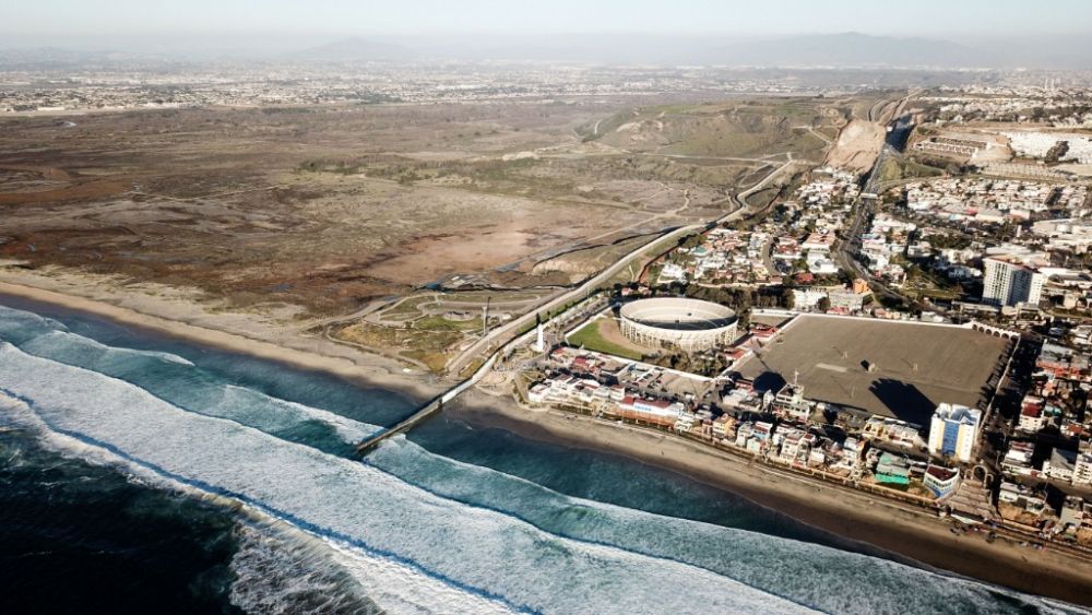 2019年1月10日在墨西哥边境城市蒂华纳航拍的美墨边境墙。画面左侧为美国,画面右侧为墨西哥。(新华社记者辛悦卫摄)