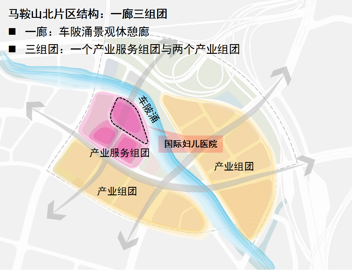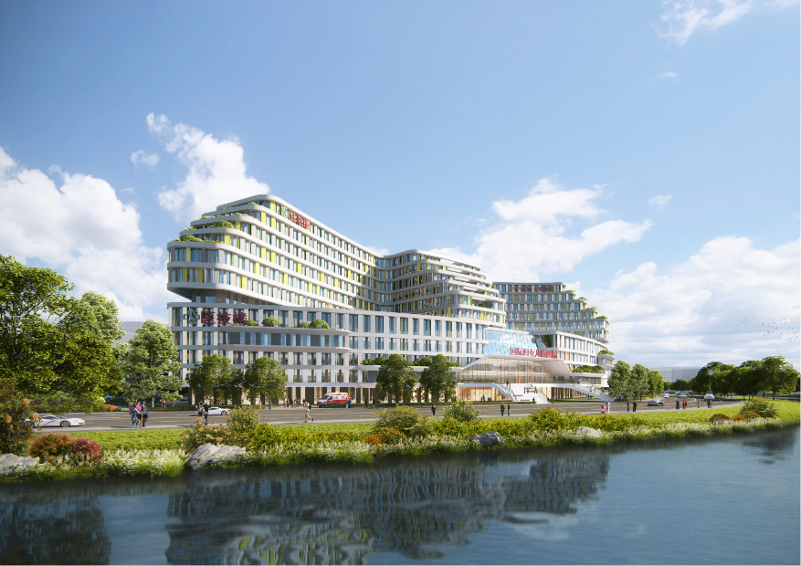 国际妇儿医院布局于马鞍山北片区中产业服务组团内,紧邻车陂涌。综合研究国内外同类型医院后,本次规划医院床位数300~350个,建筑面积约6.5万~7.3万平方米。交通组织方面,通过合理的场地设计实现地块内人车分离,所有停车需求均在地下车库解决;在门诊入口两侧设置港湾式停靠区,不占用公共道路,保障交通顺畅。设置4个人行出入口(门诊、急诊、住院、医务)和4个车行出入口(病人、医务、污物、后勤)。与此同时,医院地块的基本路网结构不变,调整局部支路网;增加3条支路,提高路网密度。