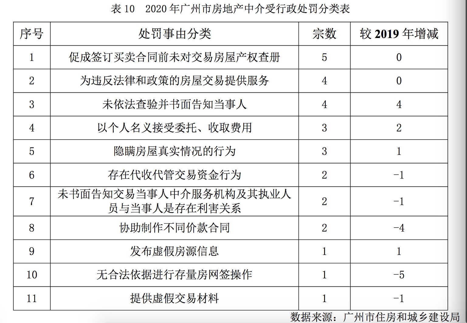 2020年,广州市住房和城乡建设局对广州市房地产中介行业共计作出28宗行政处罚及行政处理,同比2019年减少11宗,其中行政相对人为从业人员与中介服务机构的分别有13宗、15宗。被处罚最多的三种情形分别是:促成签订买卖合同前未对交易房屋产权查册、为违反法律和政策的房屋交易提供服务、未依法查验并书面告知当事人。
