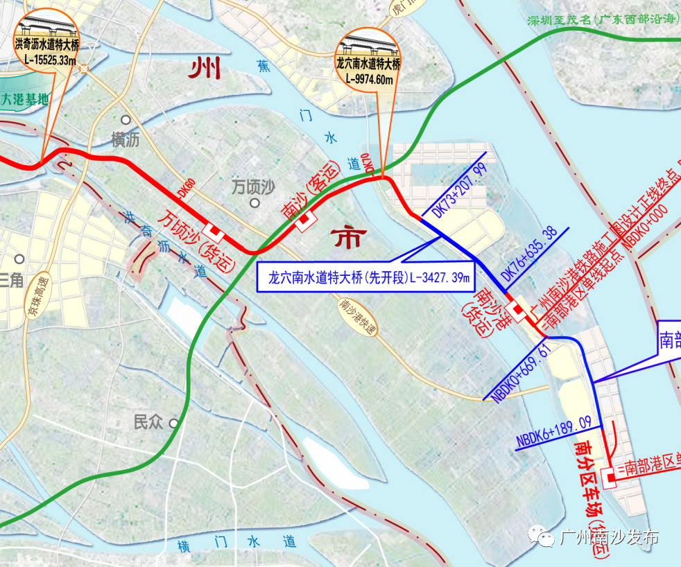 南沙港铁路自位于龙穴岛上的南沙港站引出后,经龙穴南水道特大桥进入珠江街,沿珠江街七涌北侧行进,在大致新广七路北侧设南沙站办理客运作业,跨越南沙港快速后折向西北,在万环西路东侧设万顷沙站。