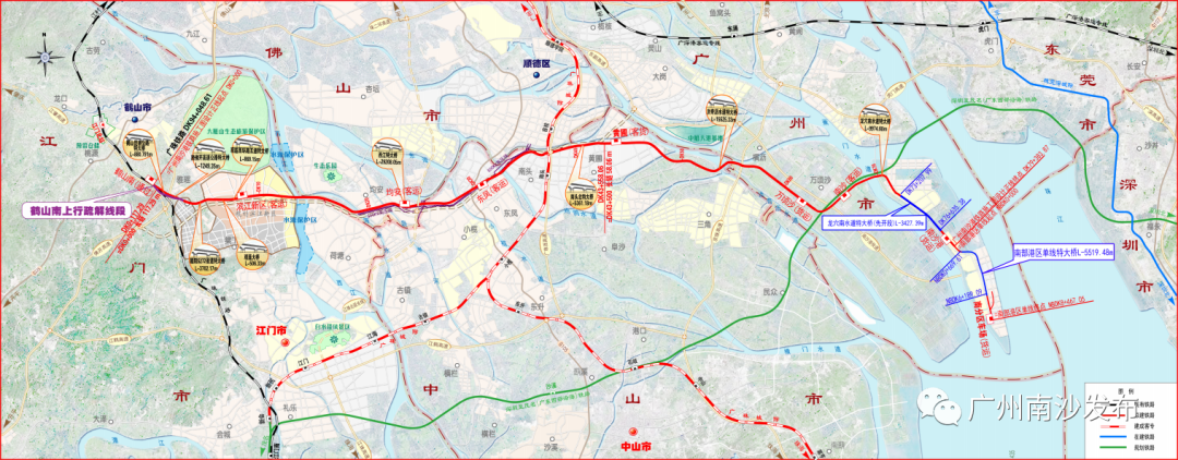 出南沙区后,南沙港铁路跨洪奇沥水道往西行进,沿线在中山设黄圃站、东凤站,在佛山顺德设均安站,在江门设滨江新区站,皆具备客运功能。南沙港铁路作为粤港澳大湾区交通发展的重要项目,是珠三角西部货运通道的重要组成部分,也是国家“一带一路”配套工程。项目建成后将港口、公路、铁路全部连通,形成立体式运输网络,打通海铁联运“最后一公里”,为沿线国家及地区商贸往来提供服务,创造出更好的社会效益和经济效益,助力广州成为世界级铁路物流枢纽。