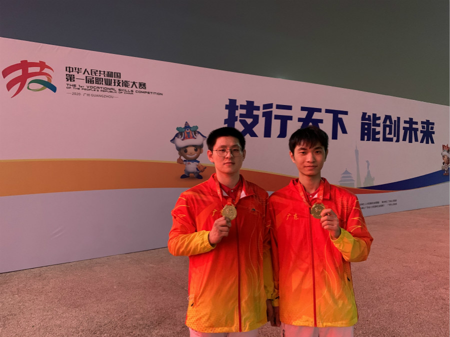 林怡峰(左)在2020年全国第一届职业技能大赛中荣获混凝土建筑项目金牌。