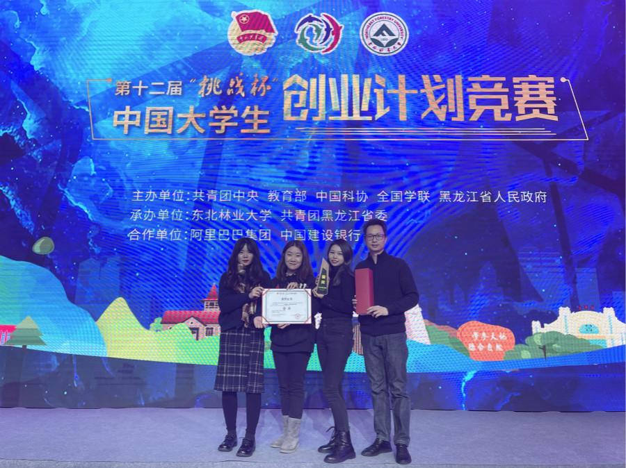 在第十二届“挑战杯”中国大学生创业计划竞赛全国决赛中,李佛君(右一)带领的团队斩获金奖。