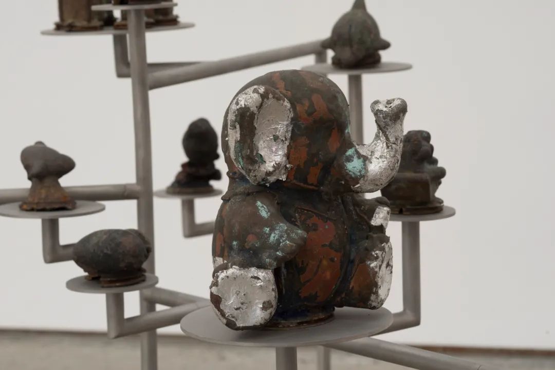 艺术家李景湖的“现在考古(东莞)”以抽象的方式将他的故乡——东莞——想象为活脱脱的考古现场。人工制品犹如在博物馆一般的摆放着,随着时间的冲刷被镀上了一层橙色和青绿色的铁锈。这些物品曾经作为工业模型而应用于大批量的玩具生产中。这些展览品散发出了考古遗迹的气质,但同时随着观察的深入,观者可以发现模具其实是世界流行卡通的人物,从辛普森到龙珠。由零碎组件一点点积攒成为一个档案馆一般的存在,揭示了东莞曾作为世界玩具工厂大区的短暂历史。由东莞生产,而后运往全世界,如此密集的大批量生产规模和产业链,如今已经从其巅峰开始呈现衰退。这座城市在上世纪八十年代改革开放经历了迅猛的工业化发展。它代表了中国现代化发展进程中出现的两种极端。艺术家通过作品,以及东莞大量的商品被迅速制造并销往全球的现状,揭示了材料是如何改变一个区域形态的,同时也反映了一种工业材料从极富价值到瞬间被淘汰的瞬时状态。从另一个角度来看,李景湖还探讨了东莞这个城市的角色,从农村农田过渡到工业城市,并且在这个角色的波动转换中,城市与自然的关系不断交恶,无法逆转。