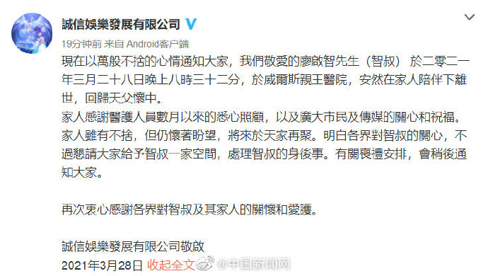 其公司诚信娱乐发展有限公司于社交平台上发文称:“现在以万般不捨的心情通知大家,我们敬爱的廖启智先生(智叔) 于二零二一年三月二十八日晚上八时三十二分,于威尔斯亲王医院,安然在家人陪伴下离世,回归天父怀中。家人感谢医护人员数月以来的悉心照顾,以及广大市民及传媒的关心和祝福。家人虽有不捨,但仍怀著盼望,将来于天家再聚。明白各界对智叔的关心,不过恳请大家给予智叔一家空间,处理智叔的身后事。有关丧礼安排,会稍后通知大家。再次衷心感谢各界对智叔及其家人的关怀和爱护。”