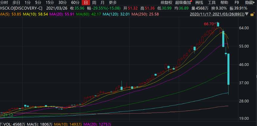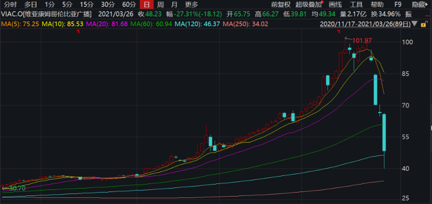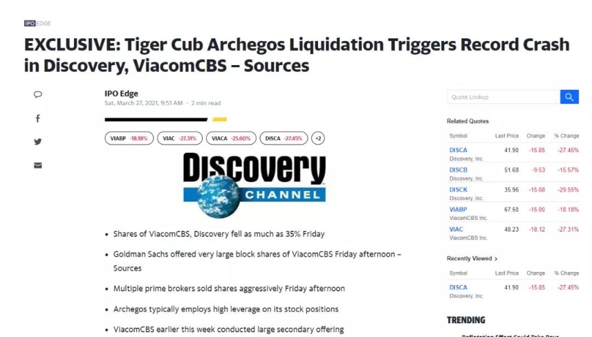 由于Archegos Capital惯于使用高杠杆,据说加到了三到四倍的杠杆,在3月23日Viacom宣布增发30亿美元之后,股价便一路暴跌,直接导致Archegos Capital开启了爆仓之旅。