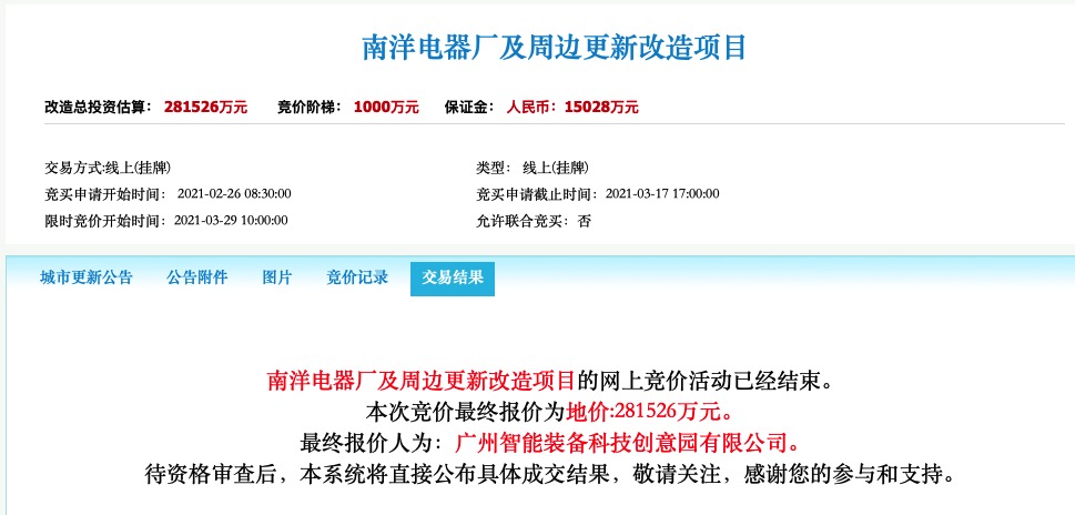 3月29日,南洋电器厂及周边更新改造项目的竞价结果出炉,广州智能装备科技创意园有限公司以地价281526万元竞得该项目。资料查询显示,广州智能装备科技创意园有限公司成立于2020年11月24日,注册地就在黄华路。最大股东为越秀地产旗下的广州市城市建设开发有限公司,持股比例为41%;第二大股东为广州智能装备产业集团有限公司,持股比例为39%,另外广州粤瑞控股有限公司持股比例为20%。