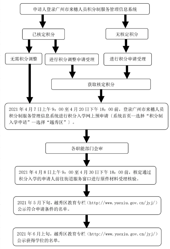 备注:凡适龄子女的父或母一方符合相应条件,可在“广州市来穗人员积分制服务管理信息系统”(网址:https://djf.lsj.gz.gov.cn/bjfpublic/login) 上报名申请入学。其中,具体的申请条件包括哪些?积分入学的申请流程是怎么样的?