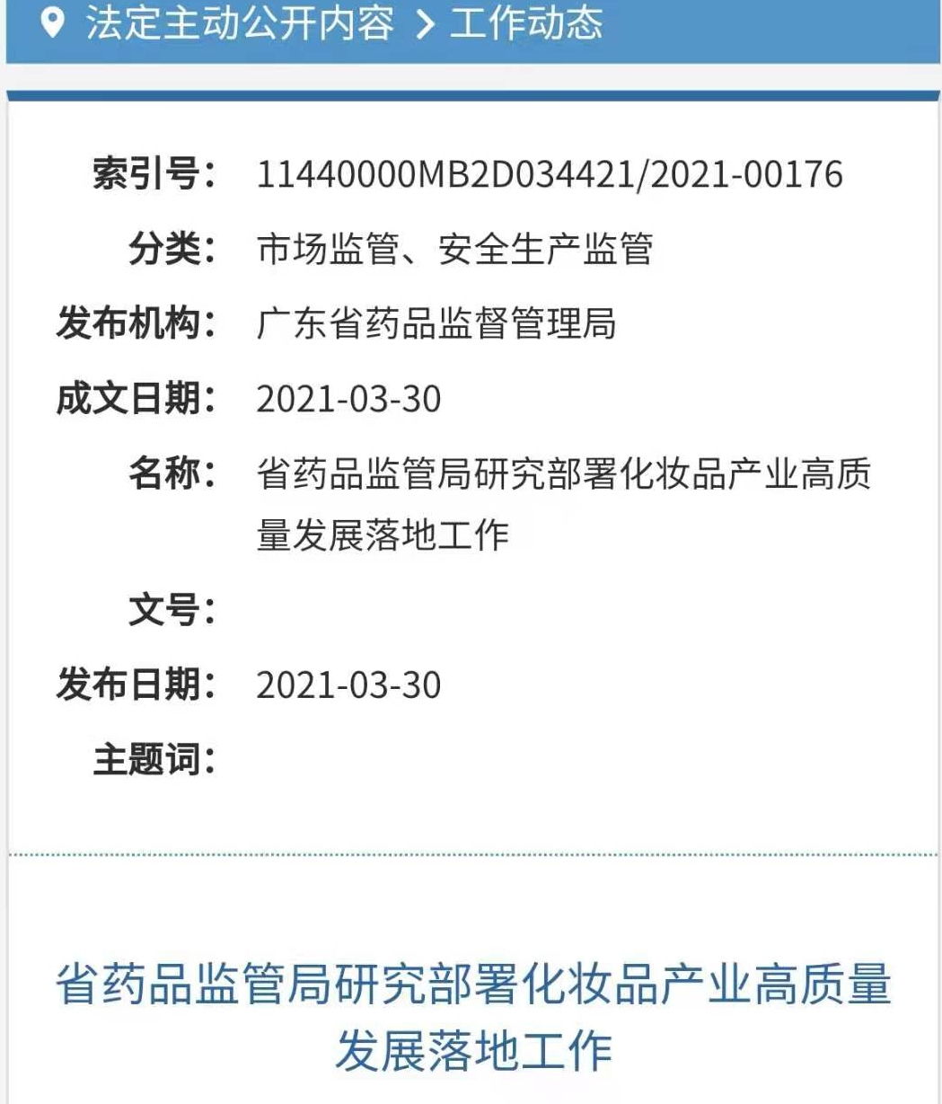 全媒体记者从广东省药品监督管理局官方网站获悉,为认真贯彻落实省政府办公厅出台的《广东省推动化妆品产业高质量发展实施方案》,切实推动各项工作举措的落地实施,近日,省药品监管局副局长王玲先后召集汕尾市、广州市及白云区、黄埔区、花都区市场监管部门负责同志研究部署具体工作。