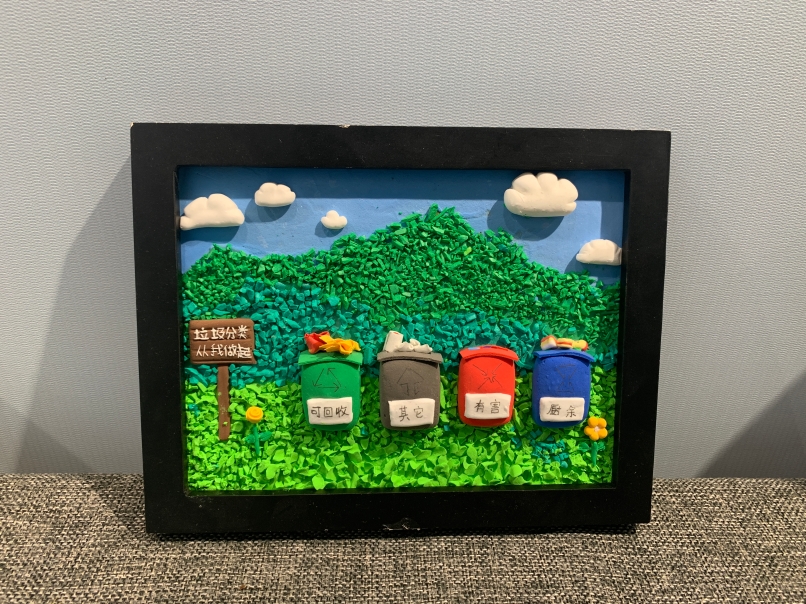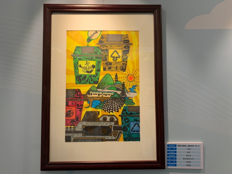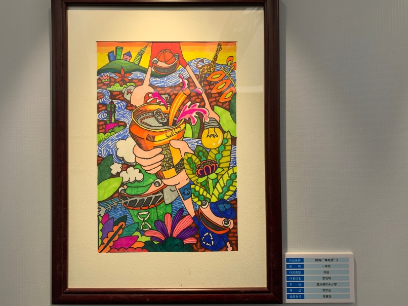 在展览现场,展示了大量利用可回收废弃物制作的手工艺品及书画作品,作品中有学生和家长共同设计的手工作品:利用生活中常见的一次性纸杯、筷子、易拉罐等生活废弃物为原料,经过创意加工后成为精美的手工艺品;有学生创作的绘画作品,将学生视角和垃圾分类主题相结合,画面生动活泼。