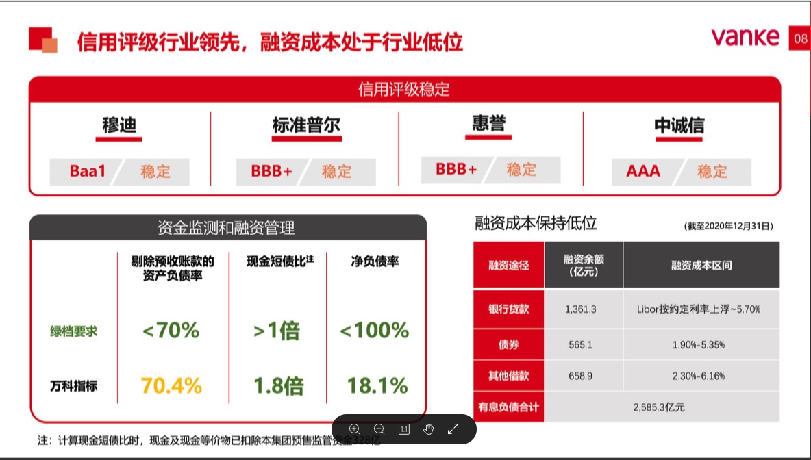 根据历年核心数据显示,万科归属于上市股东的净利润近10年的年复合增长率超过19%,加权平均ROE连续10年维持在19%以上,并已连续29年现金分红,自上市以来的分红累计达到836.9亿元。截至目前,万科已实现了经营性净现金流连续12年为正,信用评级长期保持行业领先。具体到2020年,万科持有货币现金1952亿元,为一年内到期有息负债的2.4倍;净负债率仅18.1%,并保持了连续20年低于40%。