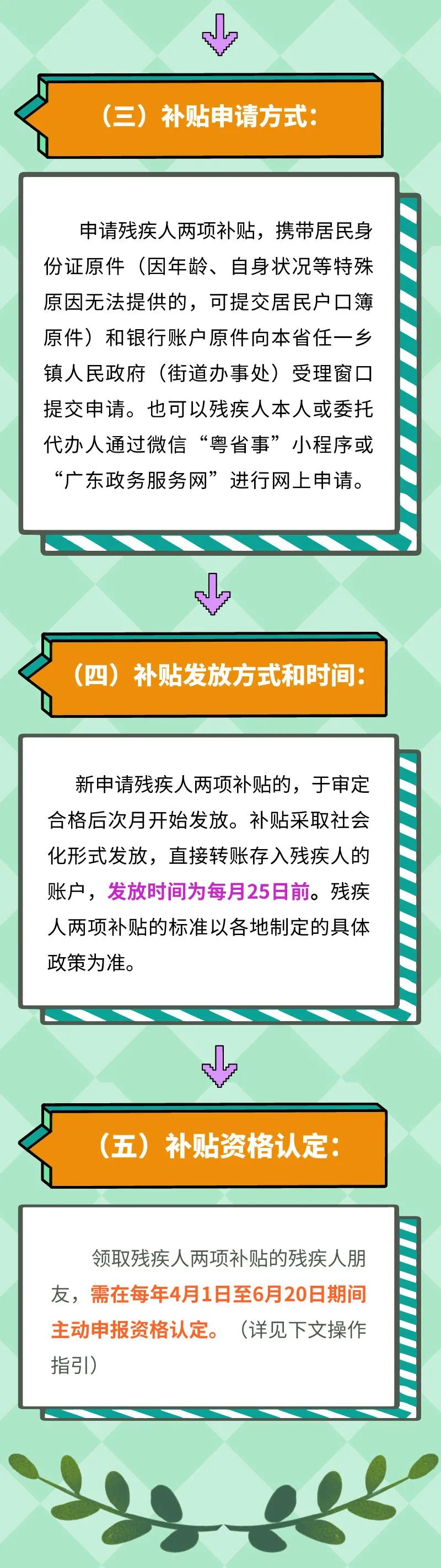《实施办法》规定领取残疾人两项补贴的残疾人,需在每年4月1日至6月20日期间主动申报资格认定,确定其当年是否符合补贴发放条件。
