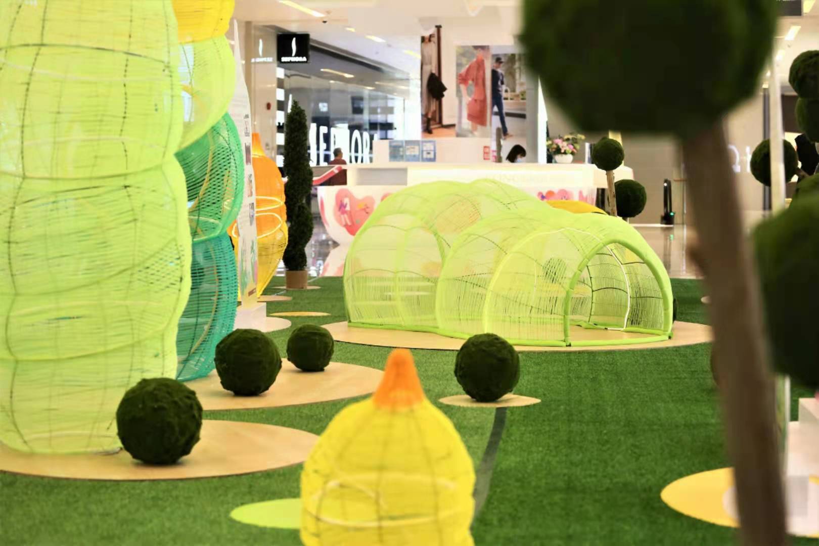 日常生活和生产中丢弃在环境中的废旧包装塑料,不仅影响市容和自然景观,对生态环境还会造成潜在危害。据研究显示,一个普通的塑料瓶,从被丢弃到完全分解,至少需要450年,而为减少塑料污染,“限塑令”的推出也得到了全社会的支持。受此启发,岭南天地在NOVA岭南站中庭打造了一组“破茧成蝶”环保艺术装置。作品以“虫茧化蝶”为灵感,打造了可以体验式打卡的场景,步入其中就好像穿梭在缤纷多彩的虫茧当中。