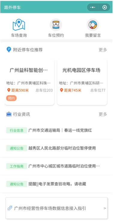 路外停车模块是相对于路内停车而言,在城市道路之外设立的经营性停车场信息服务模块,该模块可以查询车场、预约车位、推荐附近停车位、提供行业资讯、留言。