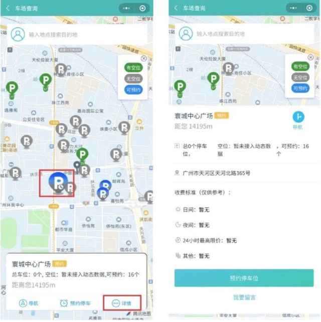 点击地图中停车场“P”图标,可查看该停车场名称、总车位数、空位数和距离等信息,点击“导航”“预约停车”或“详情”按钮可进一步实现导航、预约停车与查看该停车场详细信息(包括剩余车位、收费标注等)功能。
