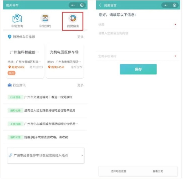 如果在使用过程中有新的意见和建议,也可以点击“广州泊车”路外停车模块首页“我要留言”进入留言模块,填写相关信息后即可提交留言。