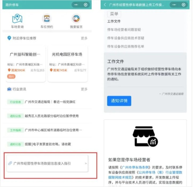 “广州泊车”路外停车模块首页下半部分为“行业资讯”模块,主要展示近期通知公告、政策法规、行业信息、工作指南等信息。点击“更多”按钮可进入资讯和公告列表,点击公告标题进入查看公告详情。