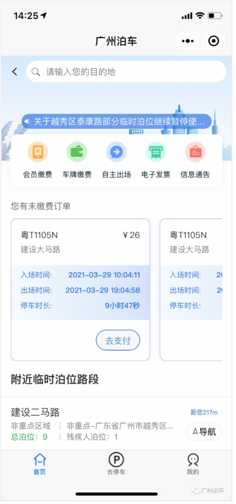 其中的路内停车模块是城市道路的路内停车泊位信息服务板块,可以提供缴费、自主出场、开发票、信息通告等功能。