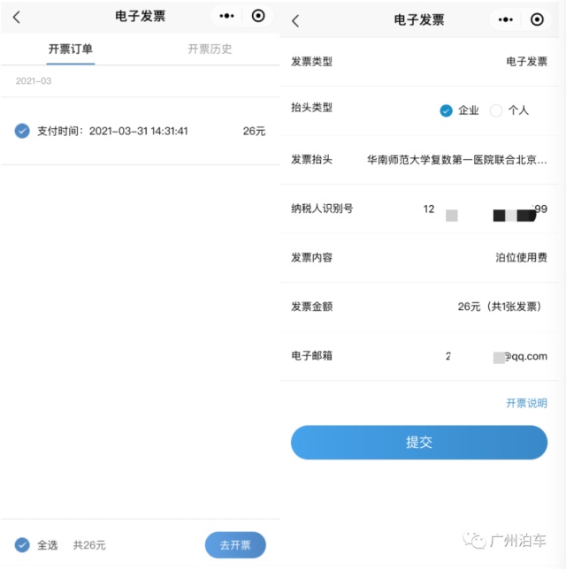 在电子发票页面,可以选择已付款但未开具发票的订单进行开票,也可以查询历史开票记录。提交开票成功后,电子发票会自动发送到已填写的邮箱里,申请人也可在开票历史中找到相应电子发票链接地址下载和使用。