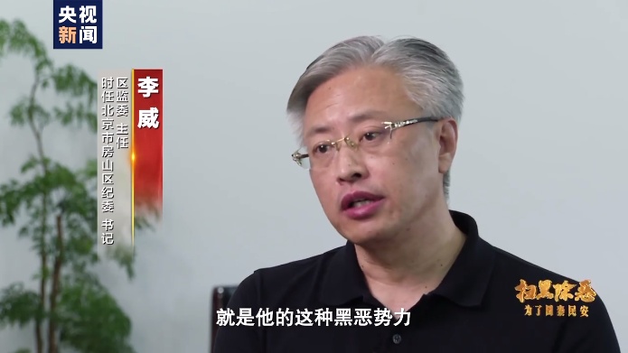 时任北京市房山区纪委书记 区监委主任 李威:在百姓心目中最终形成的是什么?就是他的这种黑恶势力,由于他的威慑力,给这个地区百姓形成的印象,他就是天,他就代表党组织,对我们党组织的整体形象破坏是巨大的。