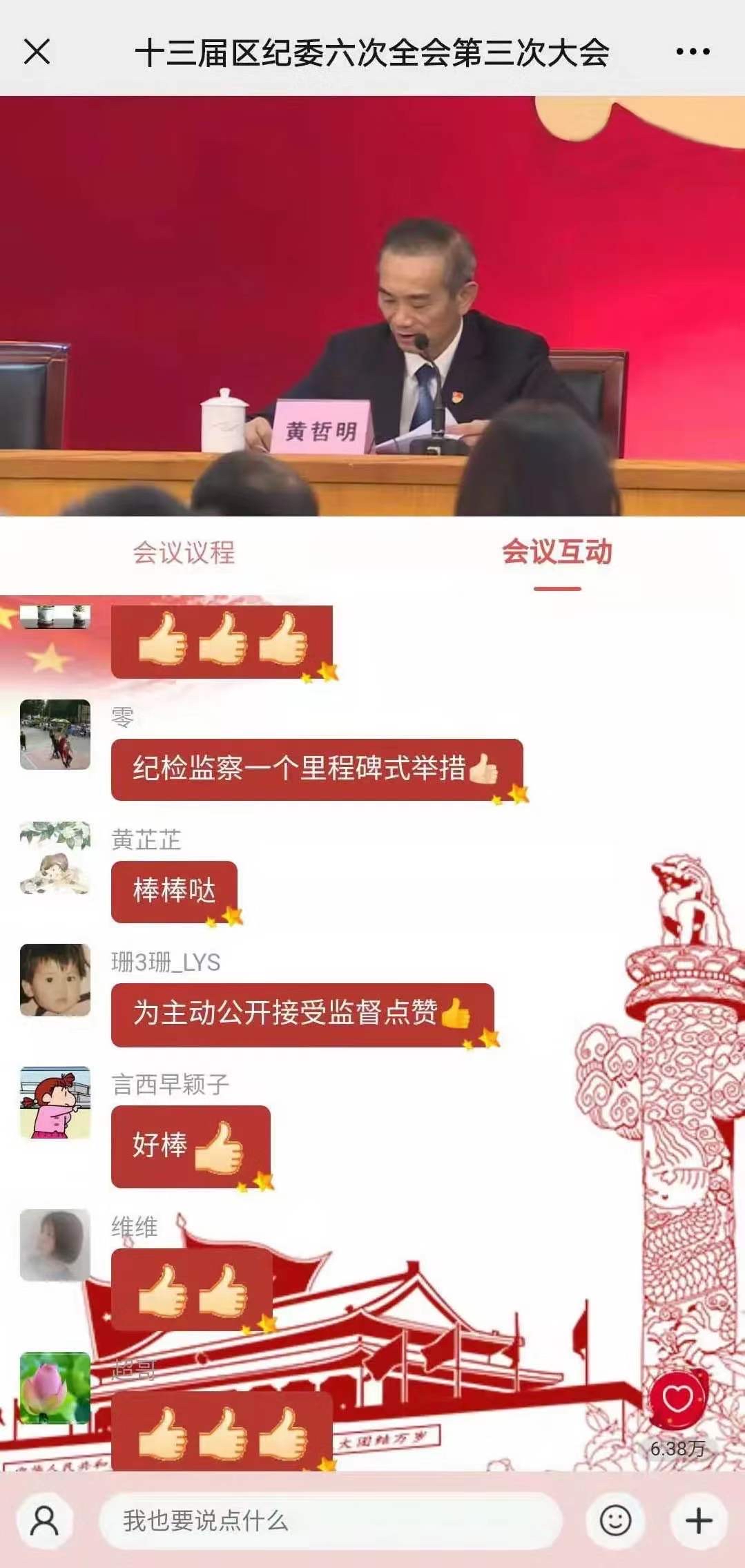 “监督上要多出这样的实招、硬招,普通公众才能越来越便捷、广泛地参与到监督中来。”“领导们向我们报告工作情况、个人事项,真正体现了人民当家做主,只有提高公众参与度、透明度,才能把监督落地落实,不断增强人民主人翁意识,提高人民的获得感、幸福感。”