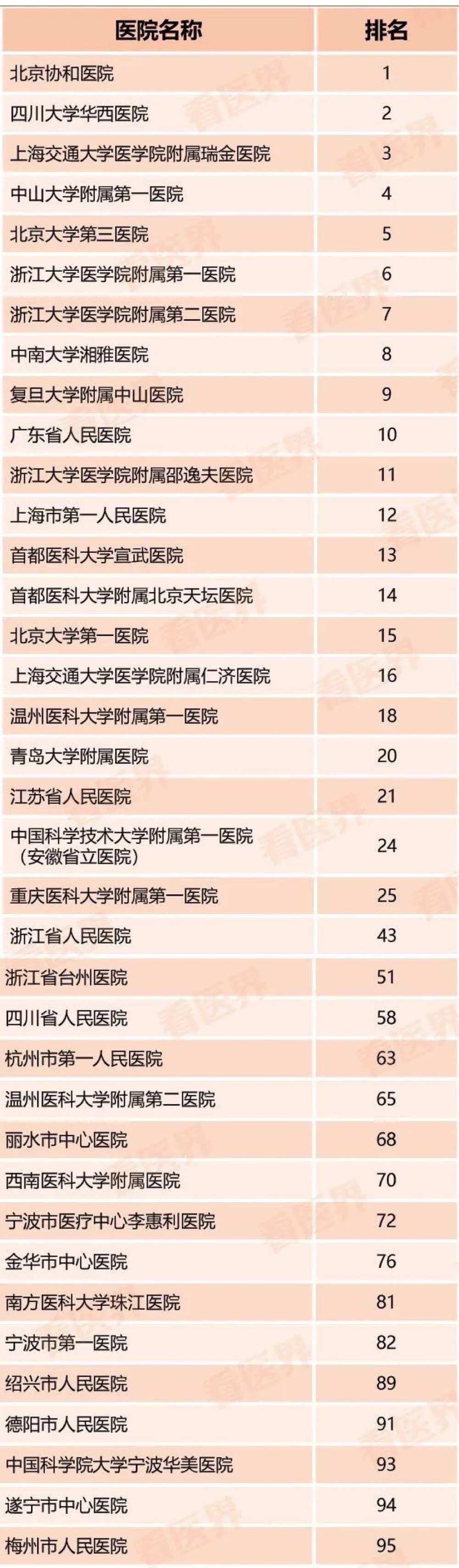 根据各家医院自行公布的消息,前100名中的广东医院还有中山大学孙逸仙纪念医院(第30名),南方医科大学珠江医院(第81名),梅州市人民医院(中山大学附属梅州医院,第95名)。