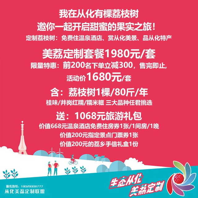 据悉,从4月开始,从化计划在全区20个(条)特色小镇、专业村首批推出5000棵荔枝定制树用于定制销售,并将陆续推出“荔枝+电商+公益+旅游+乡村”系列活动,通过荔枝定制不断丰富“荔枝+N”组合产品,推动从化荔枝实现“最晚熟”到“最早定”,促进一、二、三产业融合发展,增加农民收入。