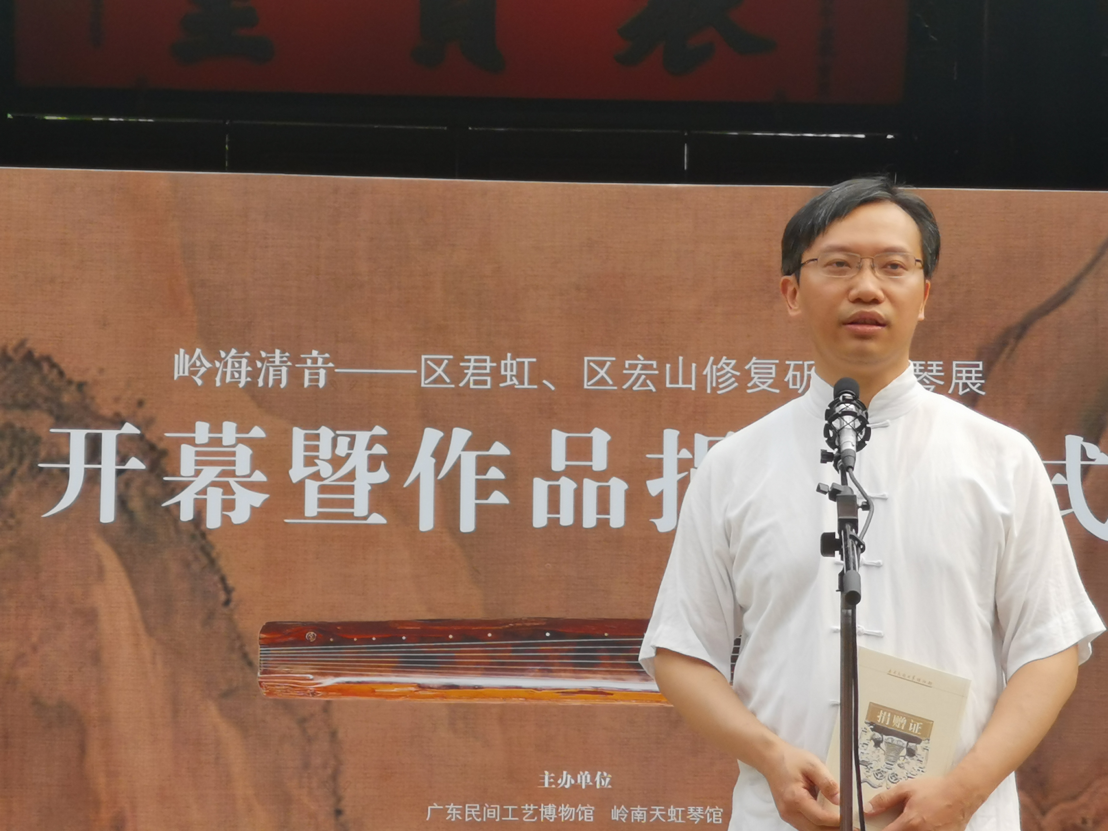 广东东民间工艺博物馆黄海妍馆长代表广东民间工艺博物馆,接受区君虹和区宏山先生捐赠的“古木春晓”古琴,并向他们颁发收藏证书。