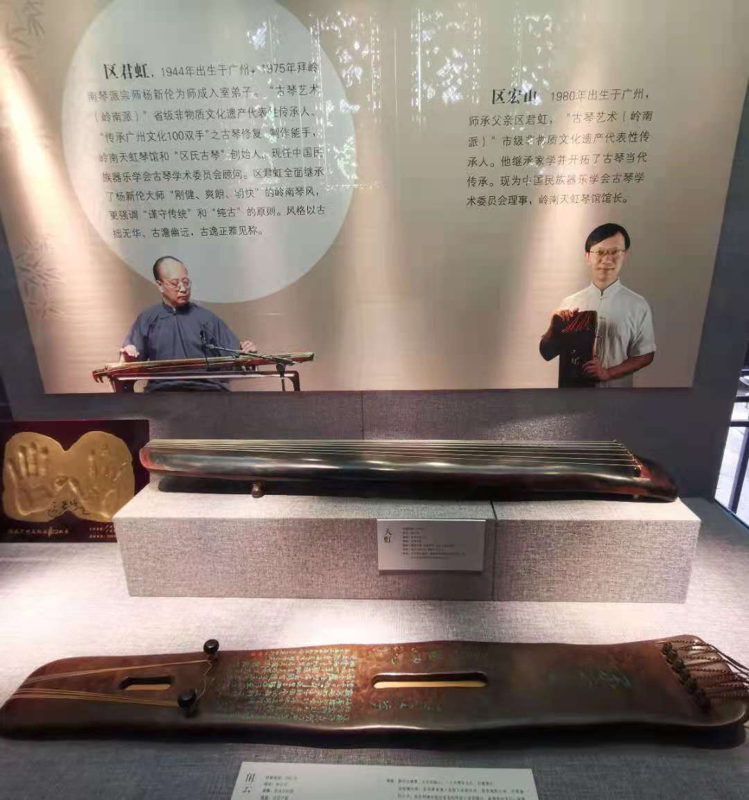 区君虹之子区宏山,自幼随父亲区君虹学习古琴弹奏、修复、斫制技艺,是“古琴艺术(岭南派)”市级非物质文化遗产代表性传承人、中国乐器学会古琴研究会理事、岭南天虹琴馆馆长,是新一代岭南古琴艺术的传承者和创新者。