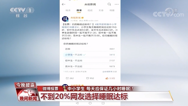 《通知》明确,小学生、初中生、高中生每天睡眠时间应分别达到10小时、9小时、8小时。而晚间新闻栏目联合央视新闻官方微博征集的网友投票显示,截至今天(2日)18点,只有不到20%(19.1%)的网友选择了达标。在不达标的网友中,高中生的比例最高,占到64%,小学生、中学生分别约占22%和14%。