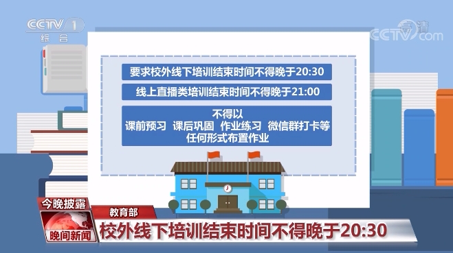 教育部近日也提出,要推进课后服务全覆盖,通过提高学校的教育质量来满足学生教育需求。针对课外培训班,通知强调校外线下培训结束时间不得晚于20:30,线上直播类培训结束时间不得晚于21:00,不得以课前预习、课后巩固、作业练习、微信群打卡等任何形式布置作业。